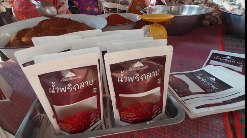 โดยนางละมูล สายสร้อย สมาชิกกลุ่ม ระบุว่า กลุ่มของตนเองนั้นชื่อว่ากลุ่ม น้ำพริกถ้ำจอมศีล ซึ่งจะมีการผลิตน้ำพริก ทั้งพริกลาบพริกแกง และพริกป่น ออกจำหน่ายโดยได้มีการรวมกลุ่มกันมาเมื่อ 1 ปีที่ผ่านมา ซึ่งมีสมาชิกทั้งหมดประมาณ 10 คน ซึ่งจะมีการรวมกลุ่มแปรรูป ในวัน จันทร์ทุกวัน หรือหากมีออเดอร์เพิ่มเติมก็จะมีการรวมกลุ่มกันทำ โดยความพิเศษของน้ำพริกลาบ-แกง ในกลุ่มของตนเองนั้น จะเป็นลักษณะที่เราได้คัดสรรวัตถุดิบที่มีคุณภาพและเน้นในเรื่องของการทำให้สะอาด โดยเฉพาะวัตถุดิบนั้นจะอยู่ในพื้นที่ทั้งหมด ซึ่งมีการปลูกไว้อย่างกว้างขวางไม่ว่าจะเป็น พริก กระเทียม ข่า ตะไคร้ หรือมะแขว่น ก็จะใช้ วัตถุดิบในพื้นที่ทั้งหมด มาทำการแปรรูป โดยฝีมือของผู้สูงอายุที่มีฝีมือในเรื่องของการทำอาหารอยู่แล้ว มาช่วยกันทำ ซึ่งแต่ละสัปดาห์ จะสามารถทำออกจำหน่าย ได้ประมาณ 20 กิโล กรัม เป็นต้นไป ซึ่งจะมีการจำหน่ายทั้งลักษณะเป็น ถุงเล็ก เริ่มต้นที่ 10 บาท 20 บาทหรือจะเป็นถุง 1 กิโลกรัมก็จะอยู่ที่ 180 บาท