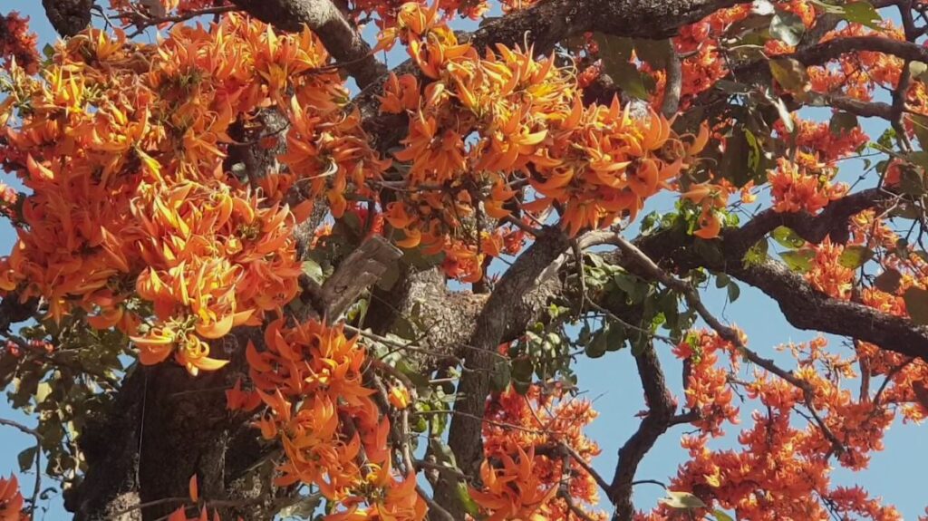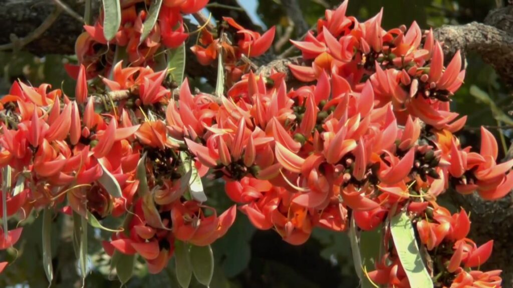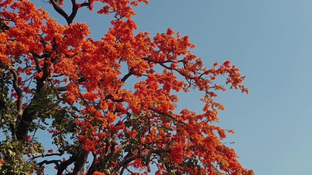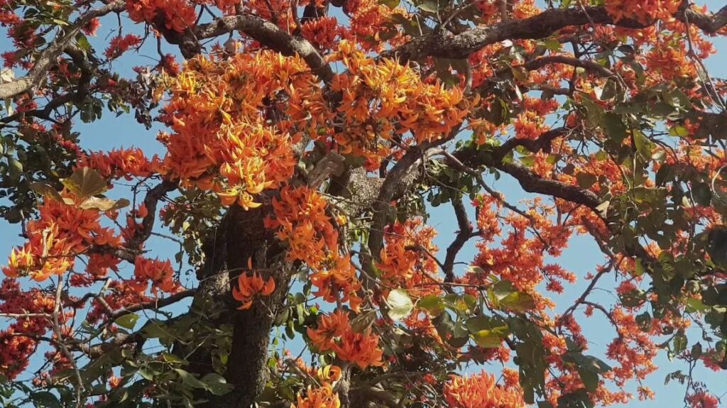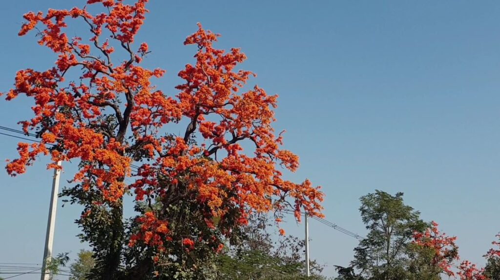 ต้นดอกทองกวาว ที่กำลังบานสะพรั่ง เป็นสีส้มตลอดสองฝั่งถนน สายพะเยา- เชียงคำ ในช่วงพื้นที่อำเภอดอกคำใต้ จังหวัดพะเยา เป็นภาพที่สร้างความประทับใจให้กับผู้เดินทางผ่านเป็นอย่างมาก หลังช่วงนี้ดอกทองกวาวที่ปลูกไว้สองฝั่งถนน กำลังบานสะพรั่งรับช่วงฤดูกาลดอกไม้ผลิ ซึ่งเป็นระยะทางกว่า 20 กิโลเมตร โดยดอกทองกวาวดังกล่าวได้มีการผลัดใบและจะออกดอกในช่วงเดือน ปลายเดือนมกราคม ไปจนถึงเดือนมีนาคม นี้ ทำให้ถนนสายนี้ซึ่งชาวพะเยาเรียกว่า ถนนสายดอกไม้ จึงมีบรรยากาศที่สวยงาม ตลอดระยะทาง เหมาะกับการท่องเที่ยวเป็นอย่างมากในห้วงนี้ นอกจากนั้นเป็นการแสดงสัญลักษณ์ว่าเริ่มเข้าสู่ช่วงฤดูร้อนแล้ว