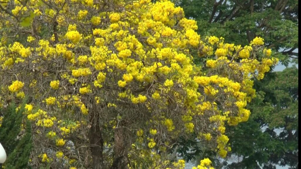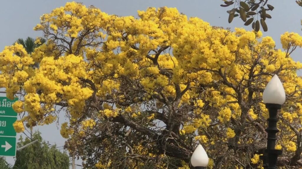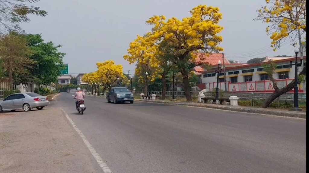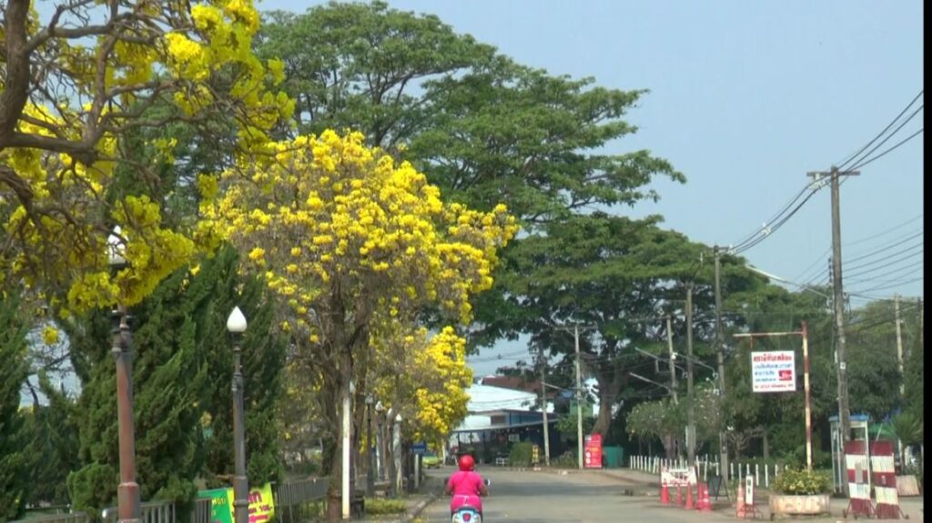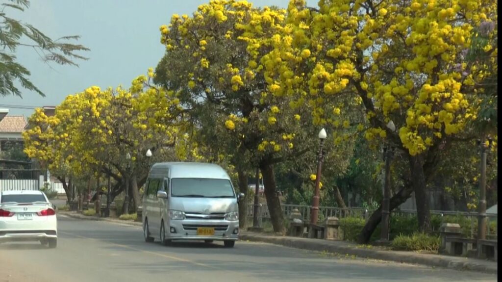 ดอกไม้งาม เหลืองปรีดียาธร ที่ออกดอกบานสะพรั่งเหลืองอร่าม ตามแนวถนนชายกว๊านพะเยา ก่อนถึงหาดกว๊านพะเยา ถือว่าเป็นถนนที่สวยงามในขณะนี้ หลังแนวถนนตลอดระทาง กว่า 800 เมตร กำลังออกดอกบานสะพรั่งสวยงามรับแล้ง